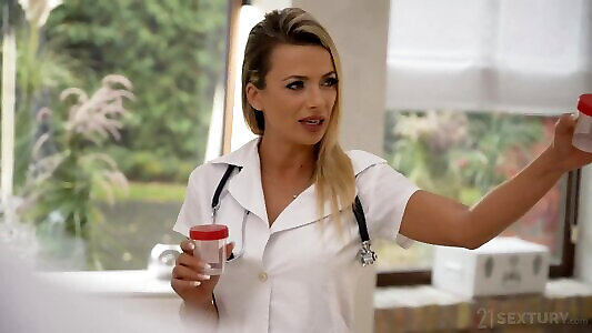 Hot Busty Blonde Sperm-bank Nurse Lets Donors Fuck Her In 3-Some And DP Her Holes To Help Them Cum