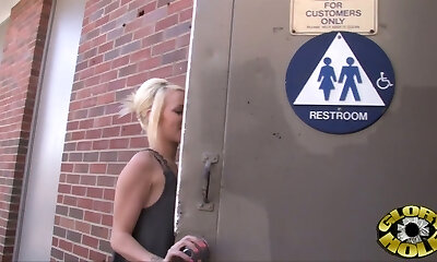 Gorgeous blonde with great melons takes a glorious black dick through a glory hole