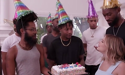 Insatiable light-haired housewife, Cammille Austin likes to get down and messy with three horny black guys